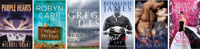 My current/upcoming reading choices are as eclectic as always – sometimes I think my ability to jump between different genres is what keeps me partly sane. As example, the top 3 books on my pile right now are a WW2 alternate history, a women’s lit and a criminal suspense/thriller. I’m also looking forward to Rosalind James’ new book that was just released (Just Say (Hell) No, as well as Laura Kaye’s newest Blasphemy book (On His Knees. I’m sure a few other books will move their way up the pile over the next week, but these are the ones I am most looking forward to. I should also finish up I’ll Meet You There by Heather Demetrios as well as read my ARC of Hello Stranger, the newest by Lisa Kleypas.